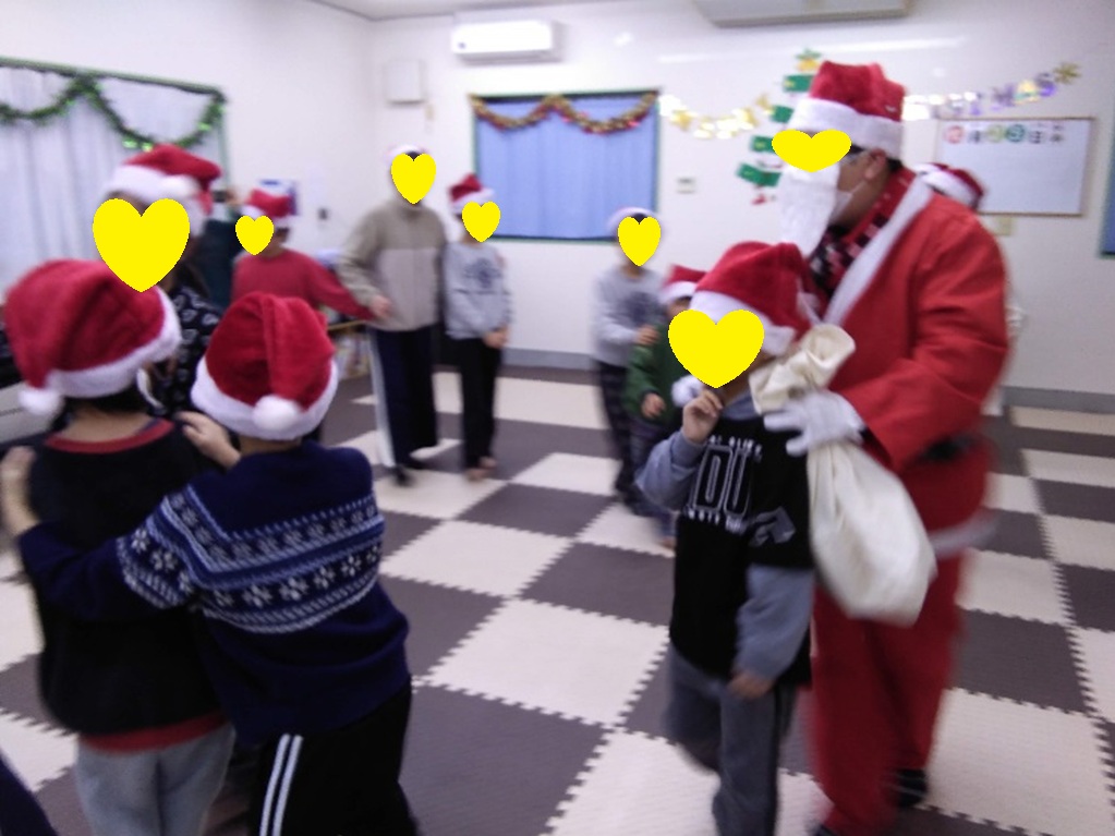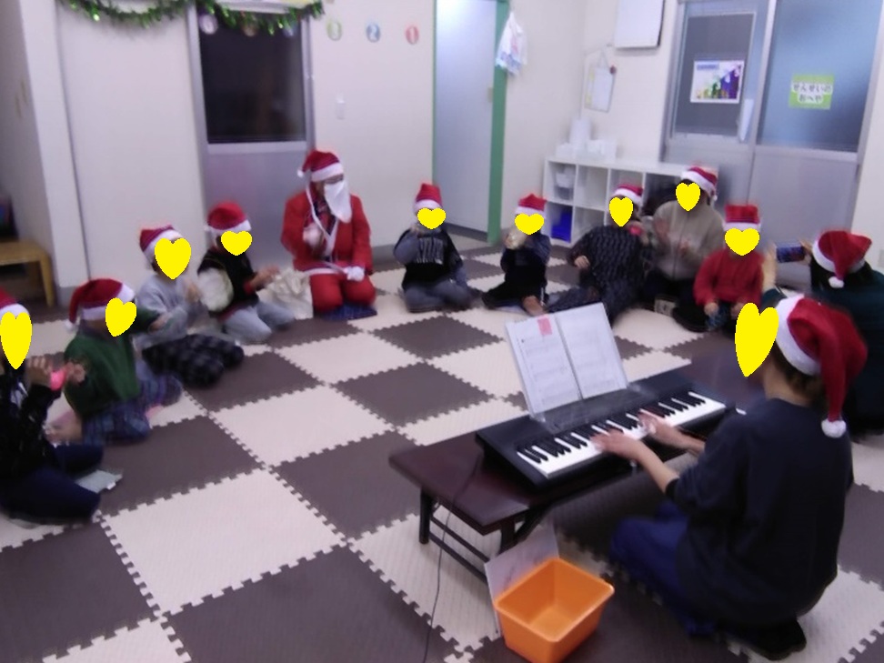 [左] <クリスマスソング> 楽器を使ってクリスマスソングを演奏しました。 演奏が始まると、素敵な音楽に誘われてサンタさんが遊びにきてくれました。 [右] <サンタ と じゃんけん列車> サンタさんと楽器演奏やジャンケン列車を楽しみました。 みんなの笑顔があふれる、心温まるイベントとなりました。
